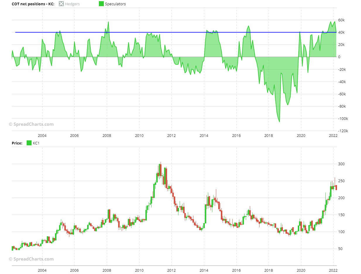 The three seasonal patterns are bullish and also well correlated. So, my trade does not go against seasonality. My analysis continues by checking how hedge funds are positioned on coffee. I do this by taking the chart with the net position of the C.O.T.