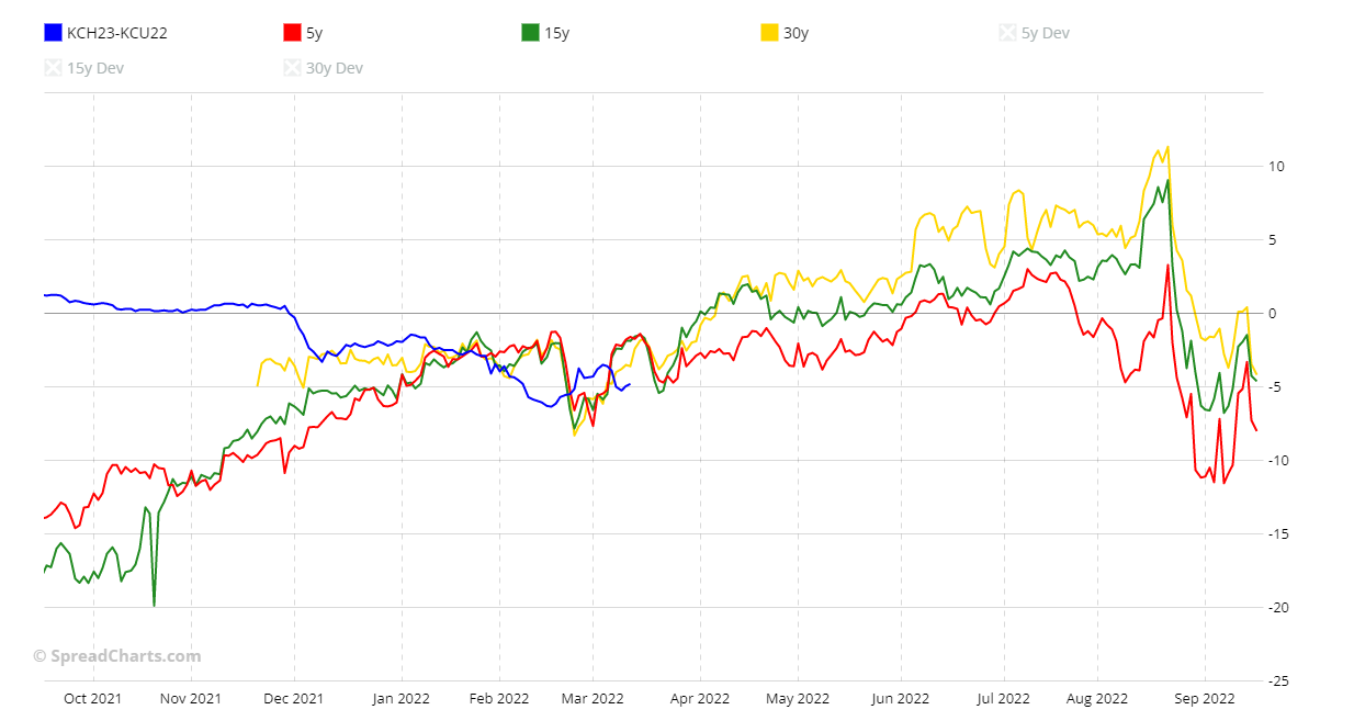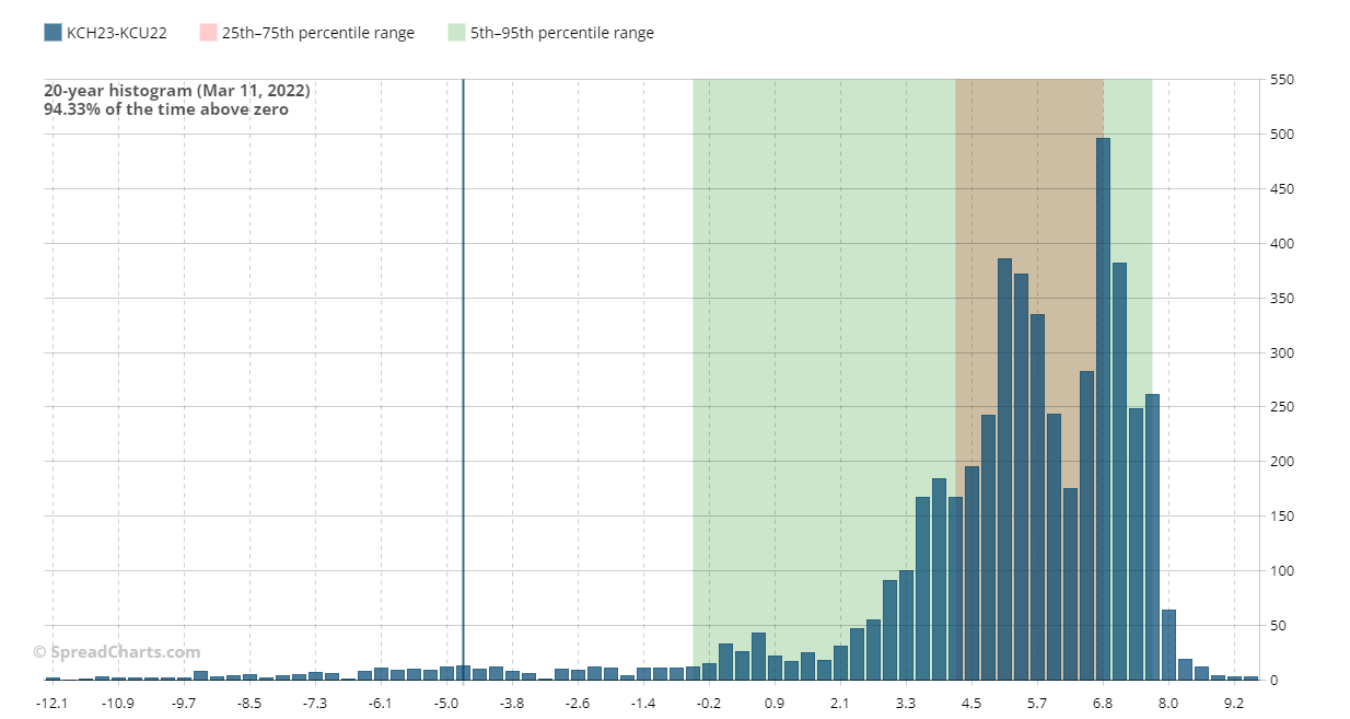 After last week's sugar (Interesting calendar spread on sugar), today I am analysing a calendar spread on another "soft" commodity, coffee. I take my cue from one of the spreads recommended by SpreadCharts, which uses its own system for choosing futures and spreads based on artificial intelligence to identify the best opportunities of the moment. The spread I am going to analyse, as constructed by SpreadCharts, is KCH23-KCU22 and I will show you why this spread caught my eye.