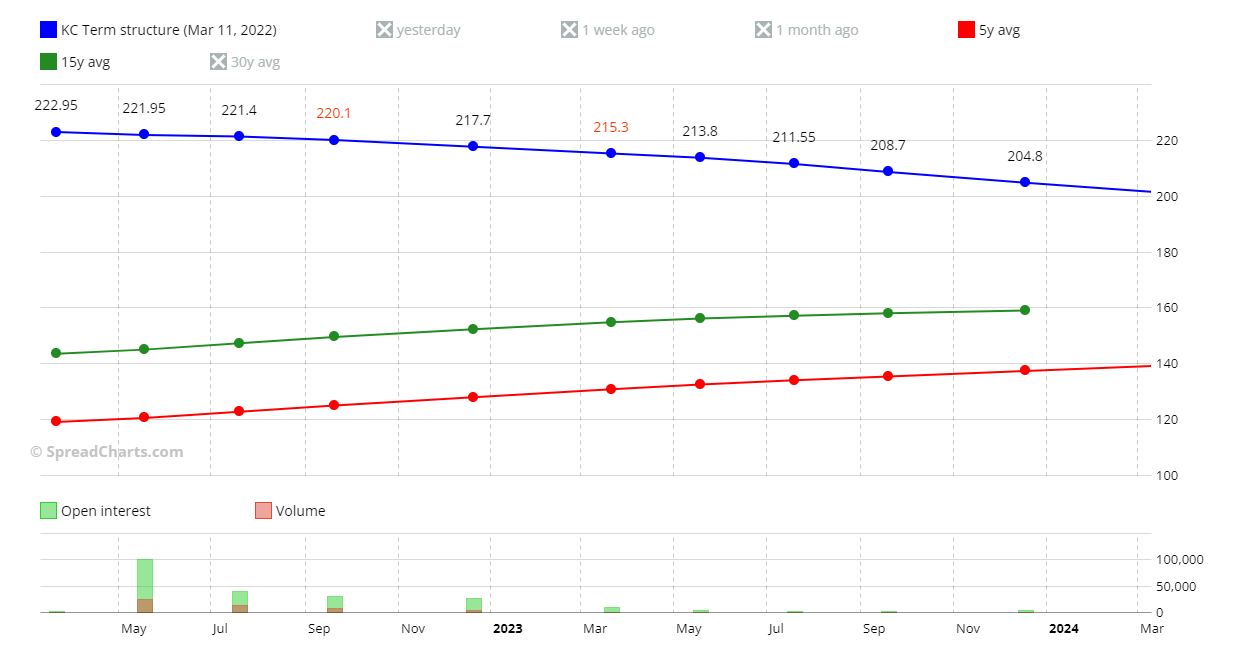 To complete this part of the analysis, I show you how a backwardation at this point in the season represents an anomaly by taking the chart of the coffee term structure.