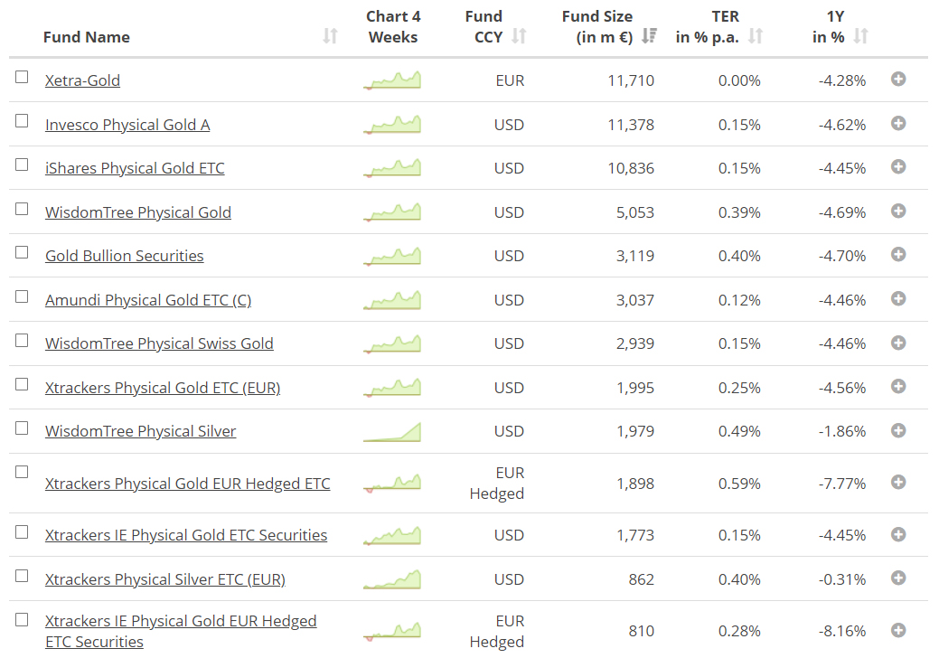 En el screener de JustETF pincho en metales preciosos y tengo toda la lista de ETCs, empezando por el oro, pasando por la plata hasta el paladio, el platino.