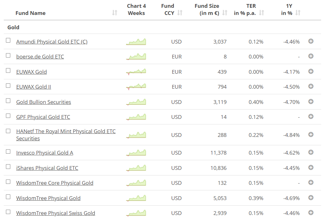 En este tercero y último ejemplo le muestro muy rápidamente cómo elegir un ETC sobre el oro. Las características que busco son un poco las mismas de siempre. Quiero un ETC líquido, con replicación física, bajos costes, sin problemas de cambio, que lleve al menos 5 años en el mercado.