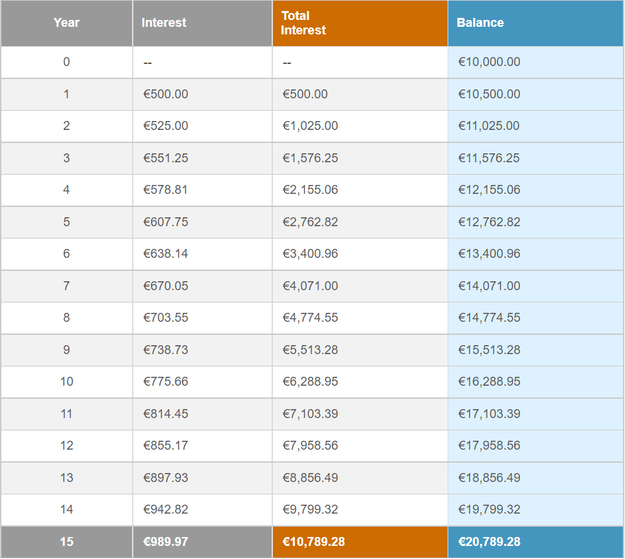 La persona que invirtió sus 10.000 euros a una tasa compuesta del 5% tendrá, al cabo de 15 años, un capital de 20.789,28 euros. Puede utilizar una calculadora en línea como ésta (https://www.thecalculatorsite.com/finance/calculators/compoundinterestcalculator.php). A continuación, puedes ver el resultado.