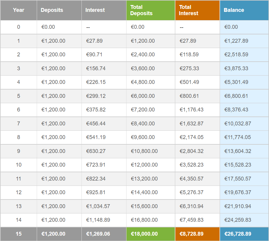 Por eso atraigo tanto a los jóvenes. Ahorra, incluso 50 o 100 euros al mes marcarán la diferencia en el mundo. Al principio será poco, pero cuando llegues a mi edad, bendecirás el día en que empezaste a hacerlo. Mira a continuación, aunque empieces de cero y pagues 100 euros al mes durante 15 años, cuánto vas a ganar.