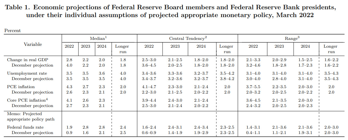 Volviendo a la reunión del miércoles del FOMC, admito que ni escuché la conferencia de prensa de Powell (tengo mejores cosas que hacer que perder el tiempo escuchando las tonterías habituales) ni leí la transcripción y los artículos. Informo de lo que la Reserva Federal prevé para 2022 (es decir, las Proyecciones Económicas) y luego saco mis propias ideas. A continuación, puedes ver el documento.