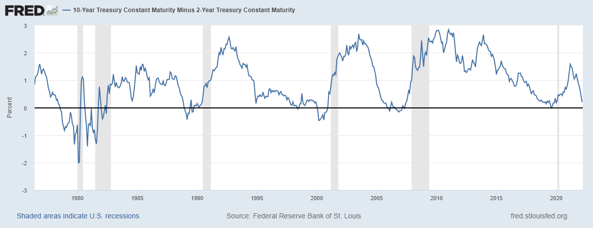 La razón por la que este spread es muy interesante y podría representar una gran oportunidad de beneficio es otra. Se trata de una combinación de acontecimientos. Por un lado, las numerosas subidas de tipos en EE.UU. han hecho que la estructura temporal se desplome en la parte inicial (tanto que a partir del segundo semestre de 2023 la curva sube). Por otro, la curva de rendimiento del Tesoro 10y - 2y está cada vez más cerca de invertirse. Como se puede ver en el siguiente gráfico.