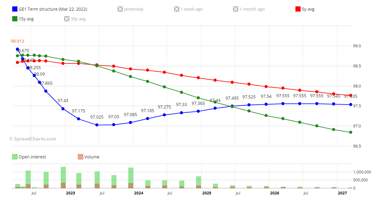 Lo spread es sobre el Eurodólar, y no tiene nada que ver con conceptos como la estacionalidad, sino que busca explotar otras condiciones que se han dado, como las numerosas subidas de tipos de interés previstas por la Reserva Federal para 2022 y que se reflejan en la estructura temporal.