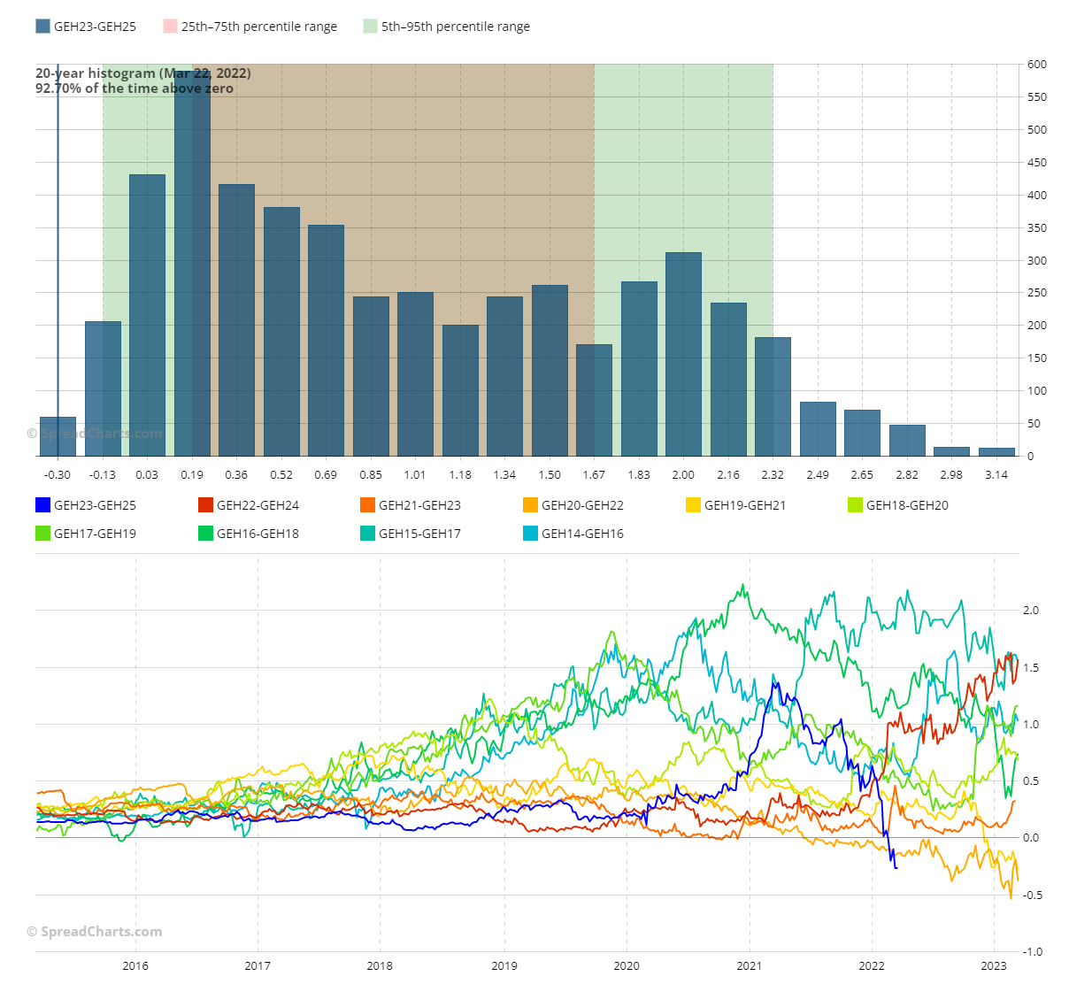 Sin embargo, esta situación es un fin en sí mismo, tiene poco valor, yo diría que ninguno. Es cierto que lo spread rara vez ha caído por debajo de cero, pero cuando lo ha hecho (GEH19-GEH21 y GEH20-GEH22) también ha cerrado siempre por debajo de cero.