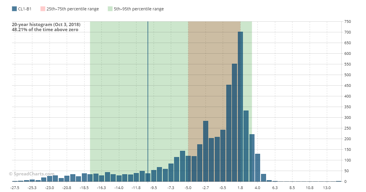 Teóricamente, cuanto más alto sea el precio de los dos futuros, más alto debería ser también lo spread. En la realidad, no siempre es así y estas son las ocasiones que podemos explotar a nuestro favor. A continuación, os muestro dos gráficos más, son el continuous histogram (histograma continuo) de lo spread a principios de octubre de 2018, último periodo en el que los futuros del petróleo (ambos, WTI y Brent) cotizaron aproximadamente a los precios actuales, y el actual.