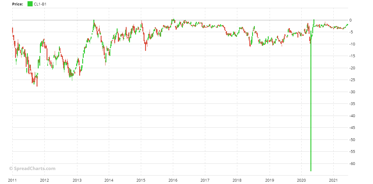 A lo largo de los últimos 10 años, con la excepción de la primavera pasada, cuando se produjo el colapso del WTI y el precio también pasó a ser negativo, lo spread se ha movido entre 0 y -20 la mayor parte del tiempo. El gráfico no nos dice mucho. De hecho, hay que tener en cuenta el precio de los dos futuros.