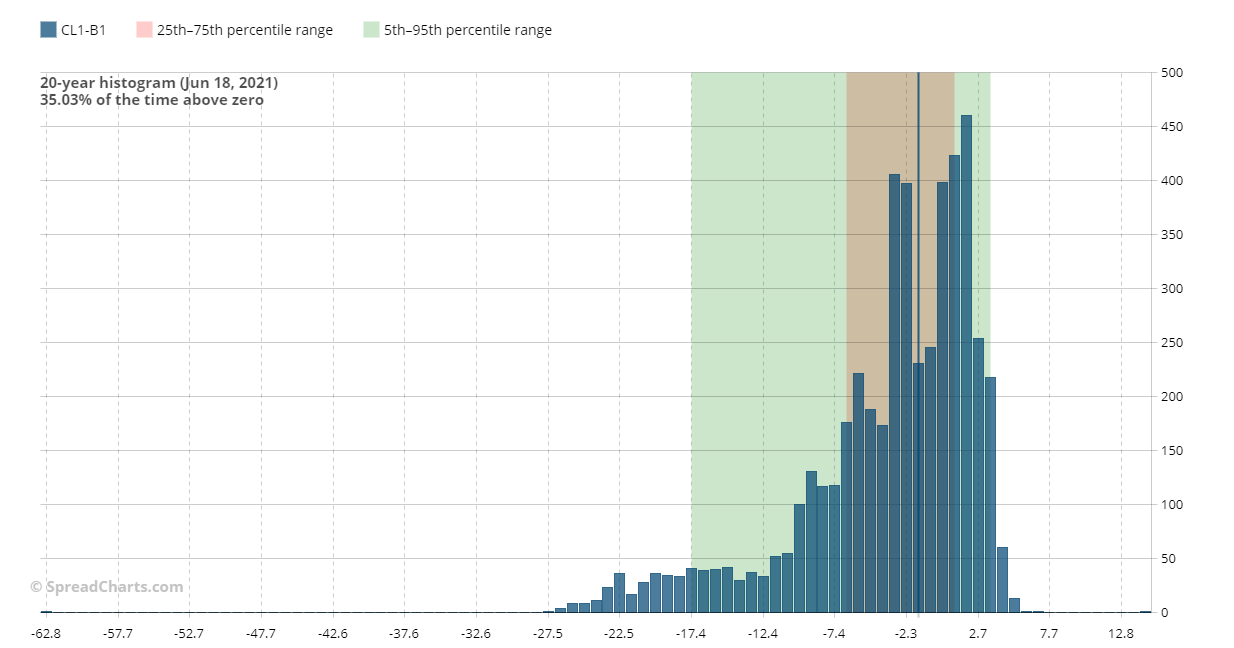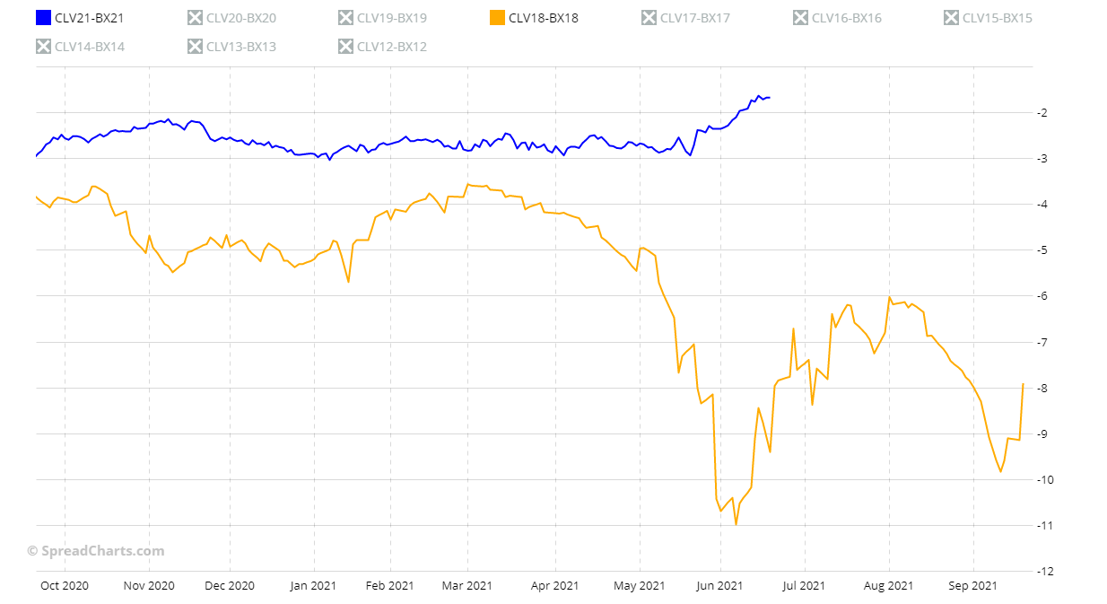 Si se leen los valores de las columnas, se puede ver bastante diferencia. El 3 de octubre de 2018, lo spread CL1-B1 (el continuo) estaba en la columna de -$ 10,3. Para ser precisos, lo spread era de -$ 9,88 (WTI $ 76,41 y Brent $ 88,29). Lo spread actual (viernes 18 de junio de 2021) está en la columna -$ 1,5 (para ser precisos lo spread es de -$ 2,08).
