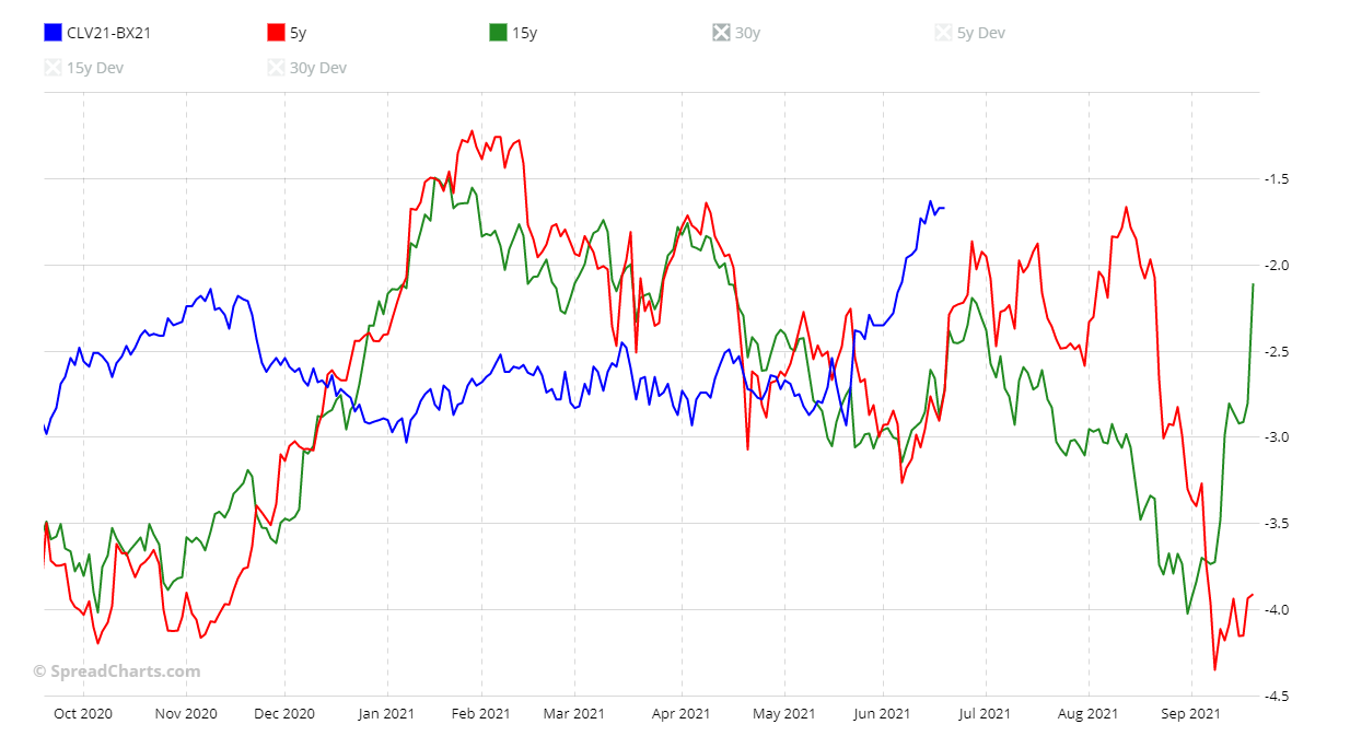 Lo spread no debe tener la primera entrega demasiado cerca (tendríamos un periodo demasiado corto para aprovechar la operación), pero tampoco debe estar demasiado lejos (los futuros serían menos líquidos y responderían menos a los cambios de precios). Tras un análisis no muy largo, me decanté por lo spread CLV21-BX21, es decir, tomé la entrega de octubre del WTI y la de noviembre del Brent. De esta manera podemos mantener la posición abierta como máximo hasta mediados de septiembre (tres meses).