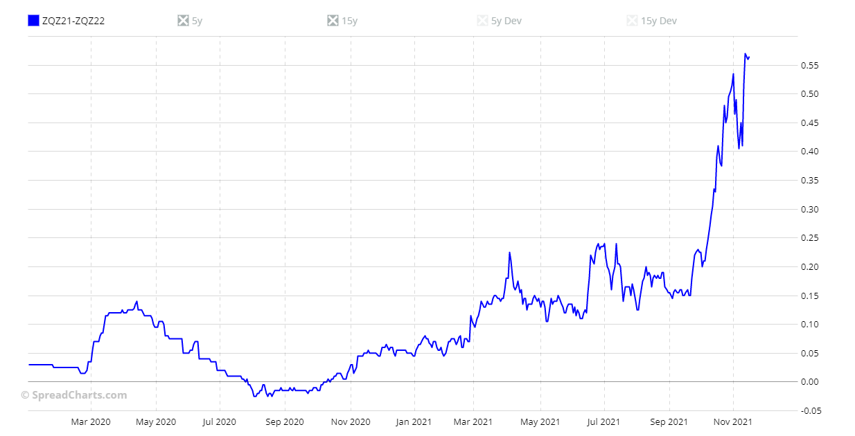 Voici le graphique du 30-Day Fed Funds futures, plus précisément le spread ZQZ21-ZQZ22 (c'est-à-dire l'échéance de décembre 2021 moins l'échéance de décembre 2022). Ce que nous dit ce graphique, c'est que les chances que la Fed relève les taux d'intérêt en 2022 non pas de 25 points de base mais de 50 points de base sont, à ce jour, de 100 %. Il est certain qu'à ce stade, les prochaines projections économiques qui seront publiées par la Réserve fédérale lors de sa prochaine réunion du 16 décembre (en plus des propos de Powell) seront intéressantes.