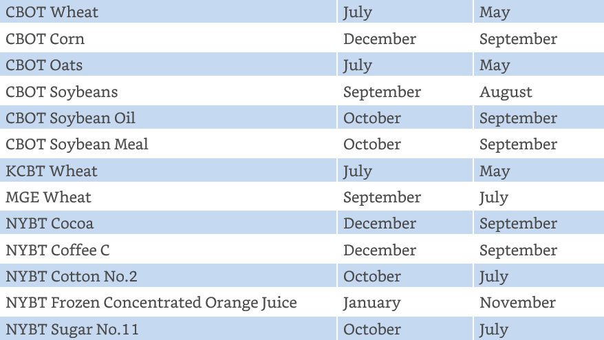 Qui sotto, puoi vedere la tabella con il Crop Year per tutte le principali materie prime.