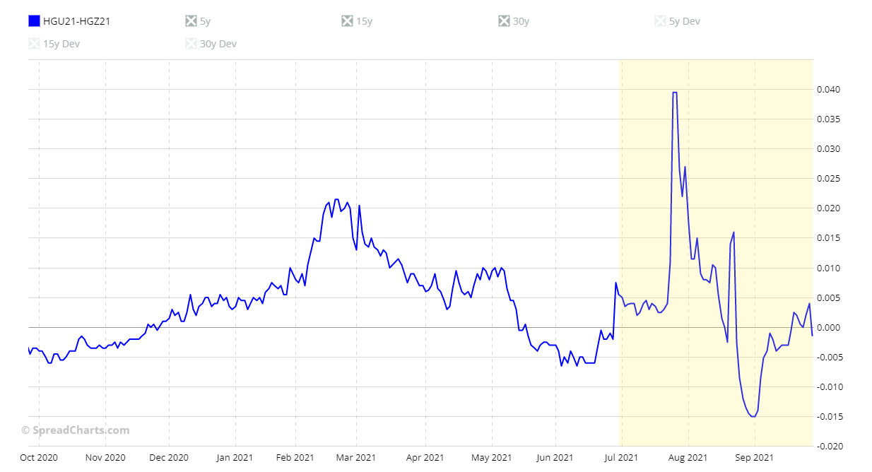 Vi mostro un paio di esempio di analisi fatte e pubblicate nel sito. La prima riguarda lo spread HGU21-HGZ21 (Un calendar spread per l’estate). Sotto il grafico al termine della sua quotazione.