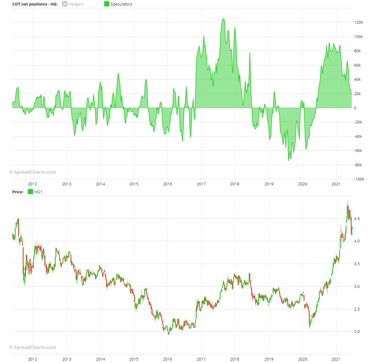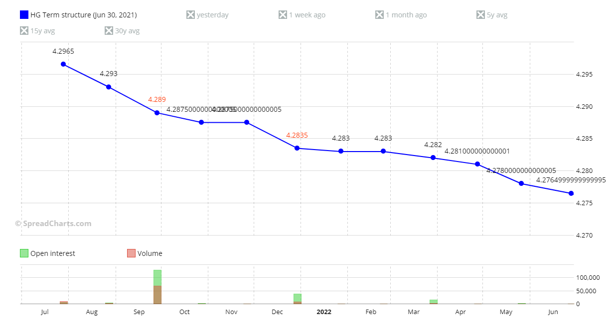 Sono ribassista sul rame per diversi motivi. Uno, come avete letto un paio di giorni fa, la Cina che vuole frenare la salita dei prezzi dei metalli non ferrosi immettendo sul mercato una parte delle sue riserve. Questo dovrebbe gettare acqua sul fuoco rialzista (tuttavia, non mia aspetto che faccia un movimento come quello del lumber dell’ultimo mese e mezzo). Ci sono poi altri aspetti dello spread che adesso vado ad analizzare.