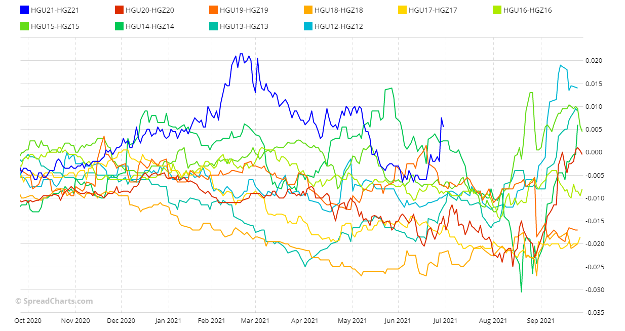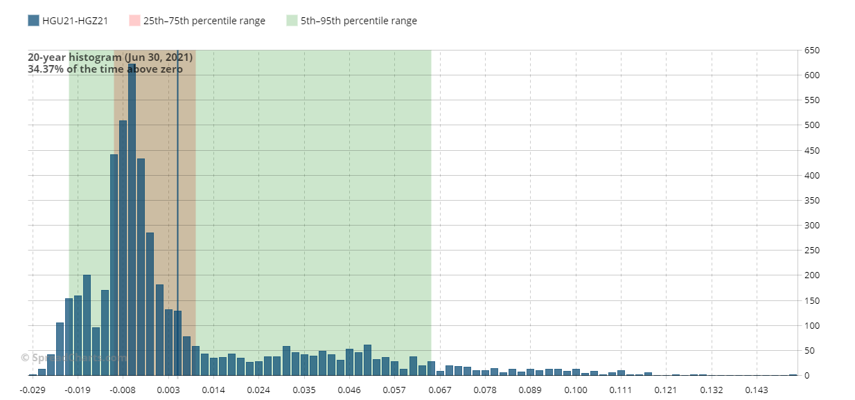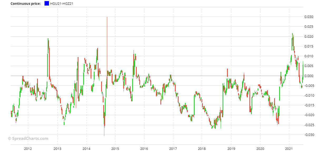 Anche se non mi piace fare trading in estate, c’è un calendar spread sul rame che trovo particolarmente interessante, precisamente HGU21-HGZ21. Lo spread ha una stagionalità ribassista da giugno/luglio