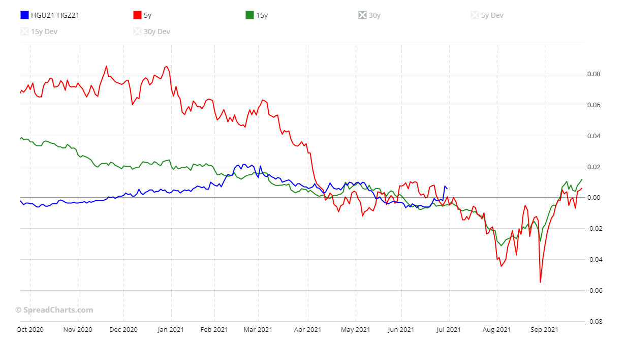 Tuttavia, riallacciandomi al mio ultimo articolo sui metalli non ferrosi (https://tradingwithdavid.com/it/metalli-cina-e-russia-cercano-di-frenare-i-prezzi/) c’è uno calendar spread sul rame che trovo particolarmente interessante. E’ uno spread presente nel mio libro sui migliori spreads del 2021 e precisamente HGU21-HGZ21. Lo spread ha una stagionalità ribassista da giugno/luglio fino ad agosto/settembre (chi ha letto il libro conosce come considero entrata e uscita di una stagionalità).