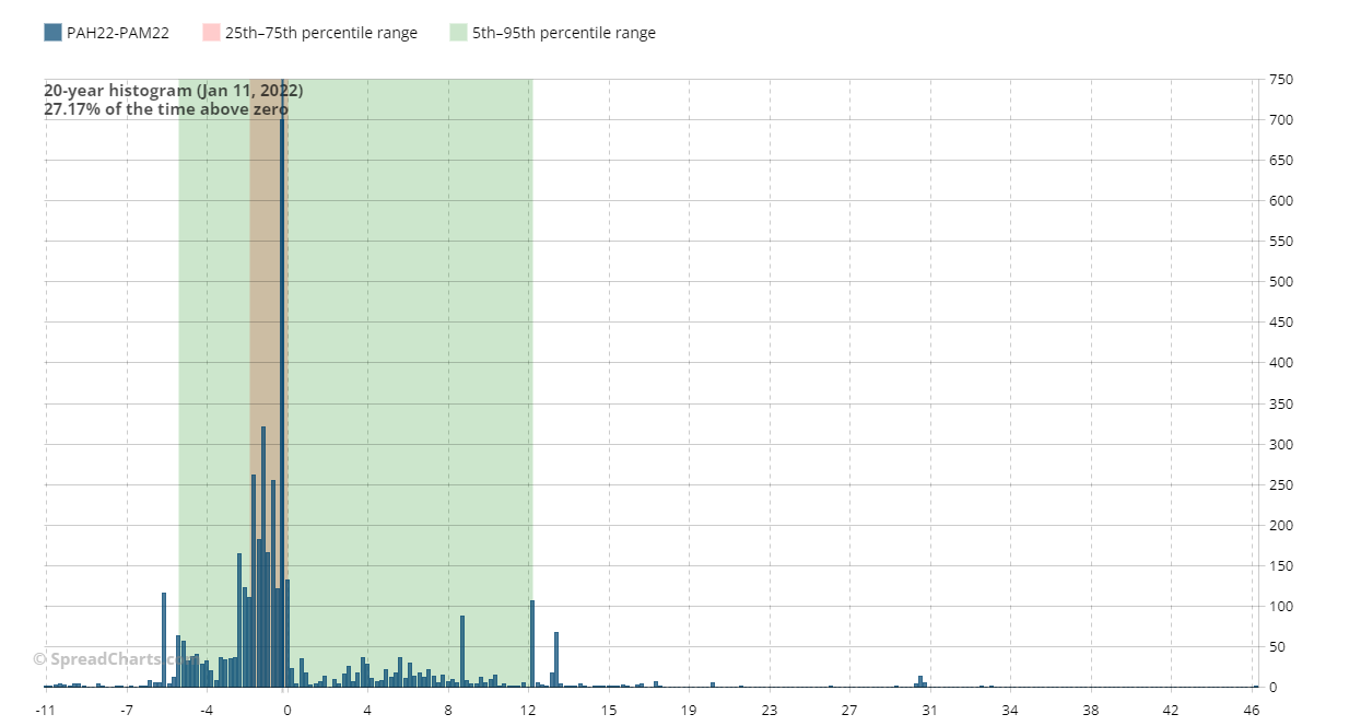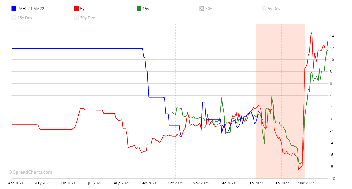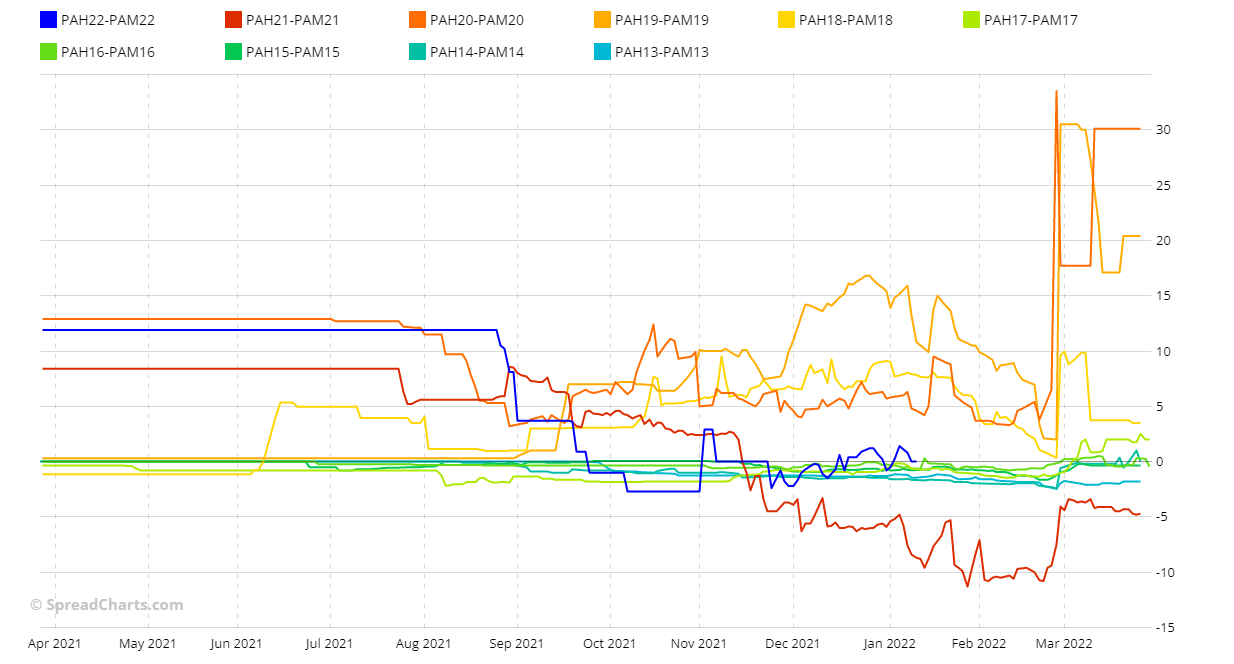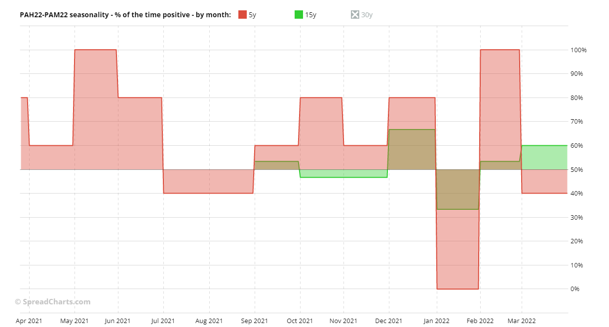 Io lavoro poco con i metalli ad esclusione del rame. Tuttavia c’è uno spread sul palladio che negli ultimi anni mi ha dato buone soddisfazioni. Si tratta dello spread PAH22-PAM22, che ogni inizio anno (gennaio-febbraio) ha una stagionalità ribassista.