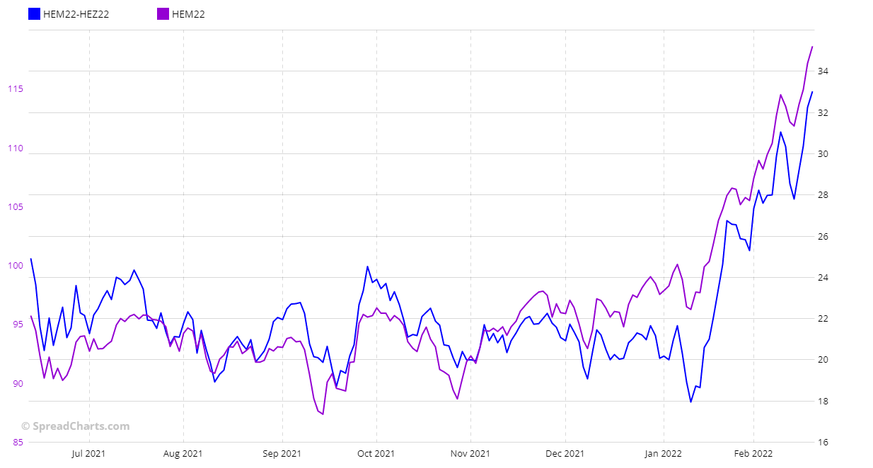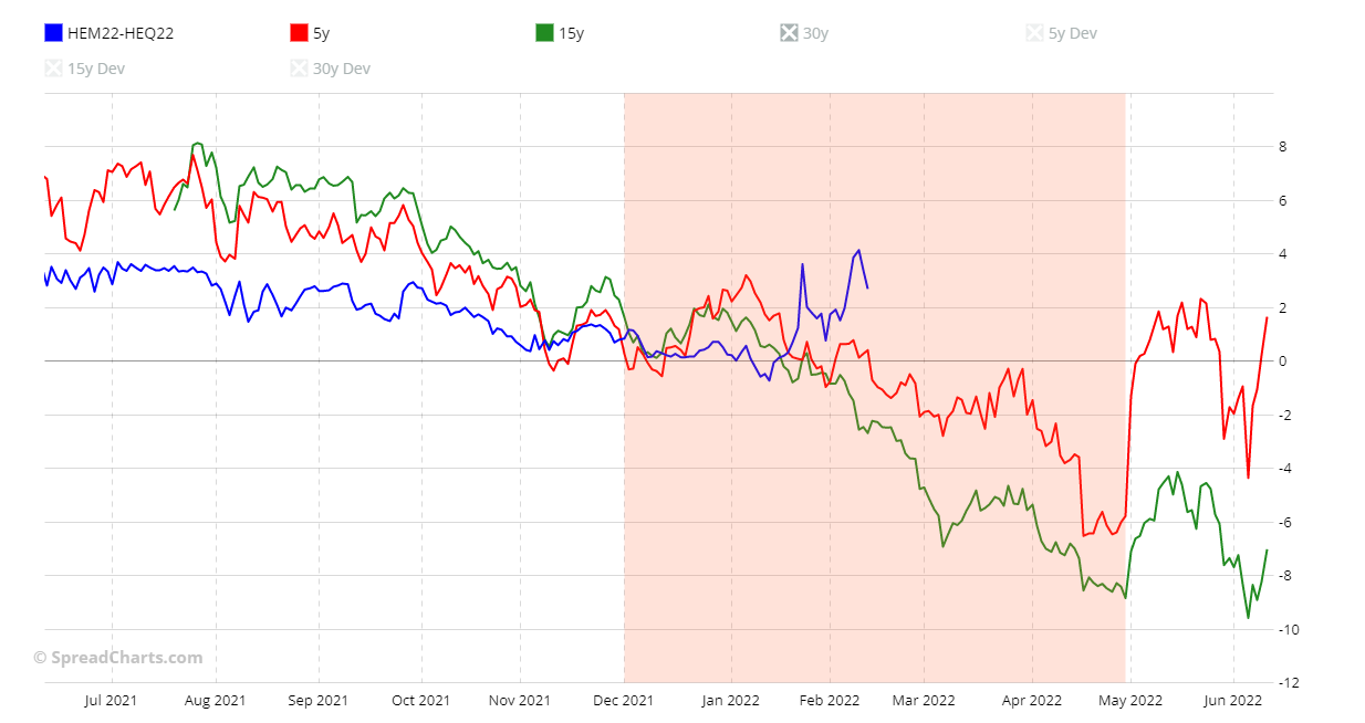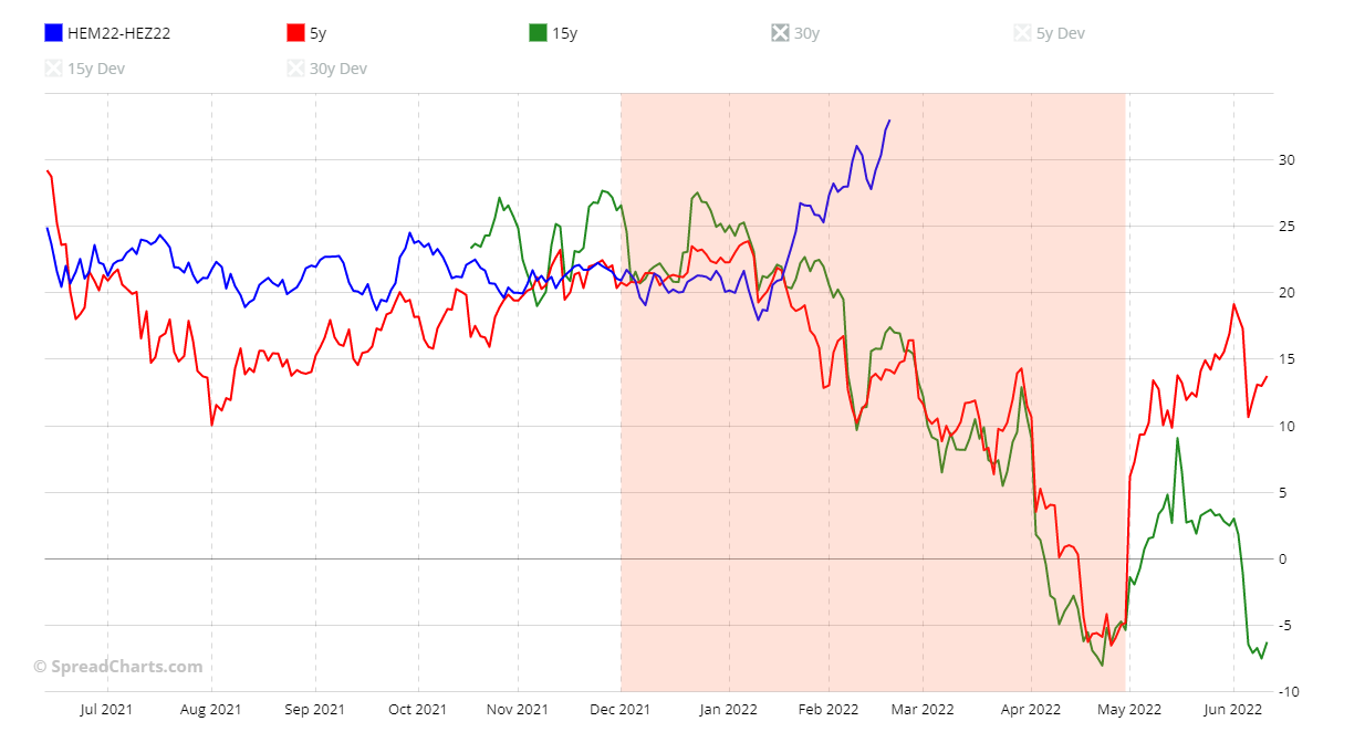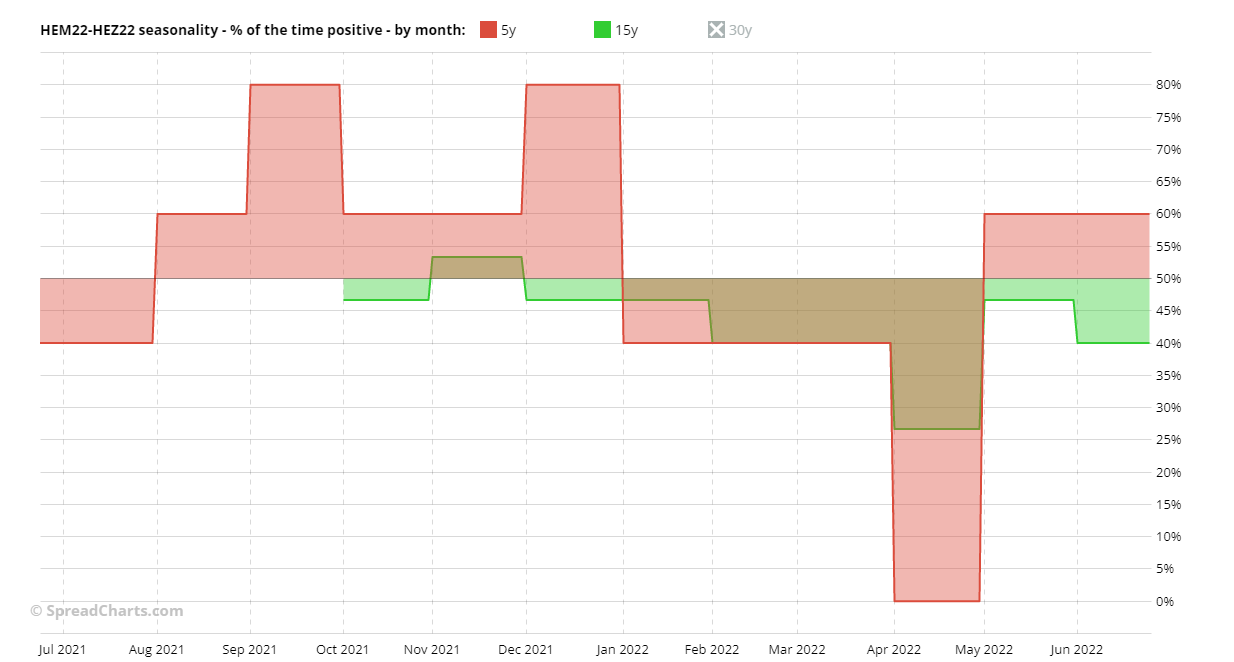 The spread is certainly very interesting graphically, less so from a fundamentals point of view. To lower the risk, you can opt for the HEM22-HEQ22 spread. The two much closer deliveries make it a bit quieter. I just show you the chart with the two seasonal patterns at 5- and 15-year.