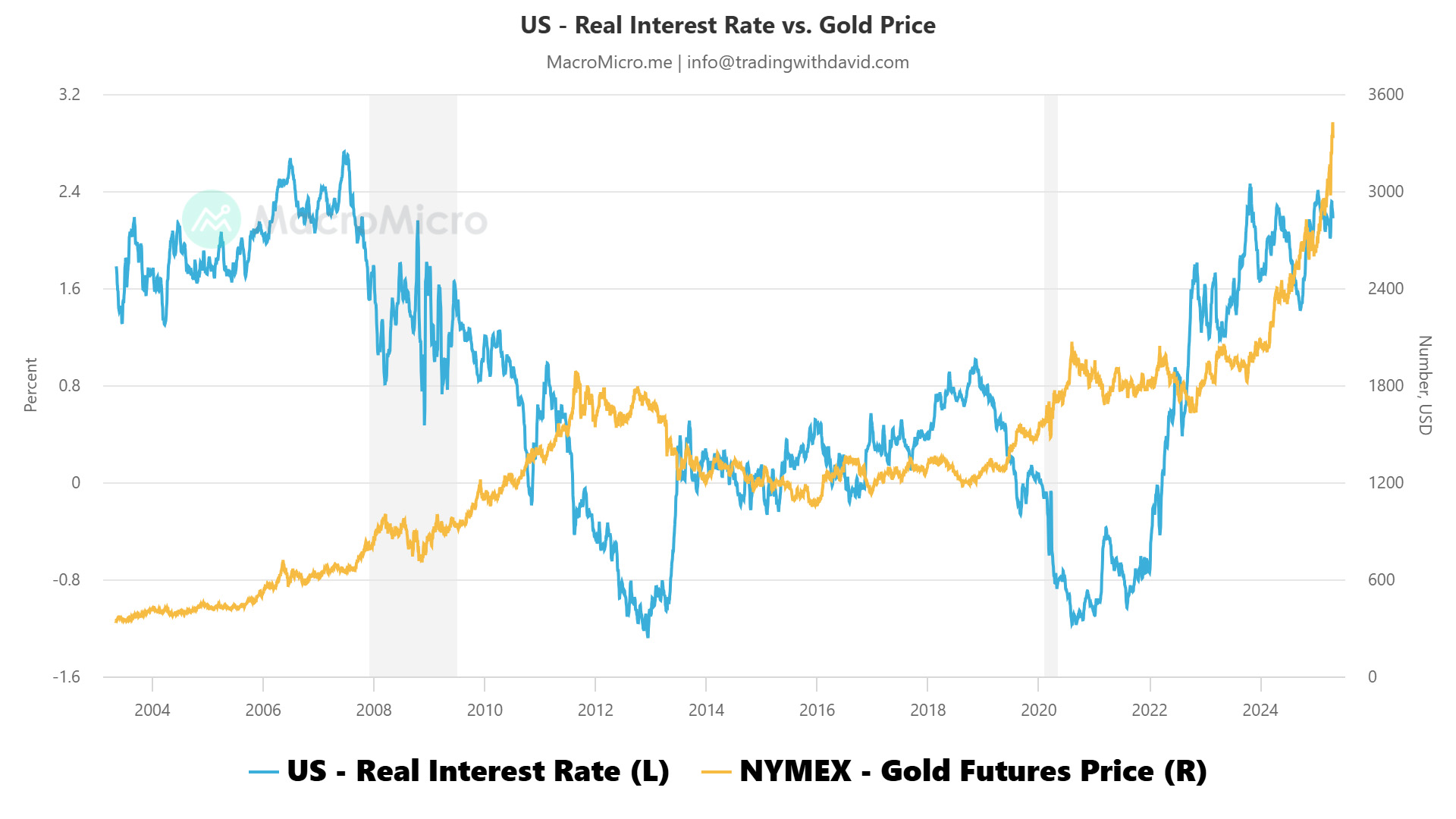 US - Real Interest Rate vs Gold Price (MacroMicro.me)