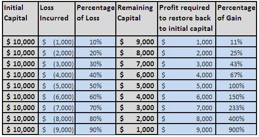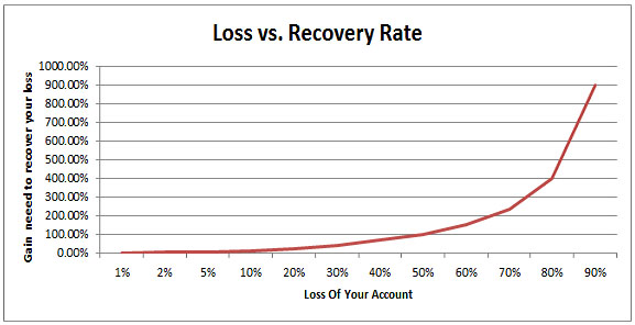 As the percentage loss of initial capital increases, the required performance to restore your capital back also increases exponentially. So, it is evident that losing 50% of your equity means that you have to get 100% performance in your remaining capital if you want to restore the initial capital.