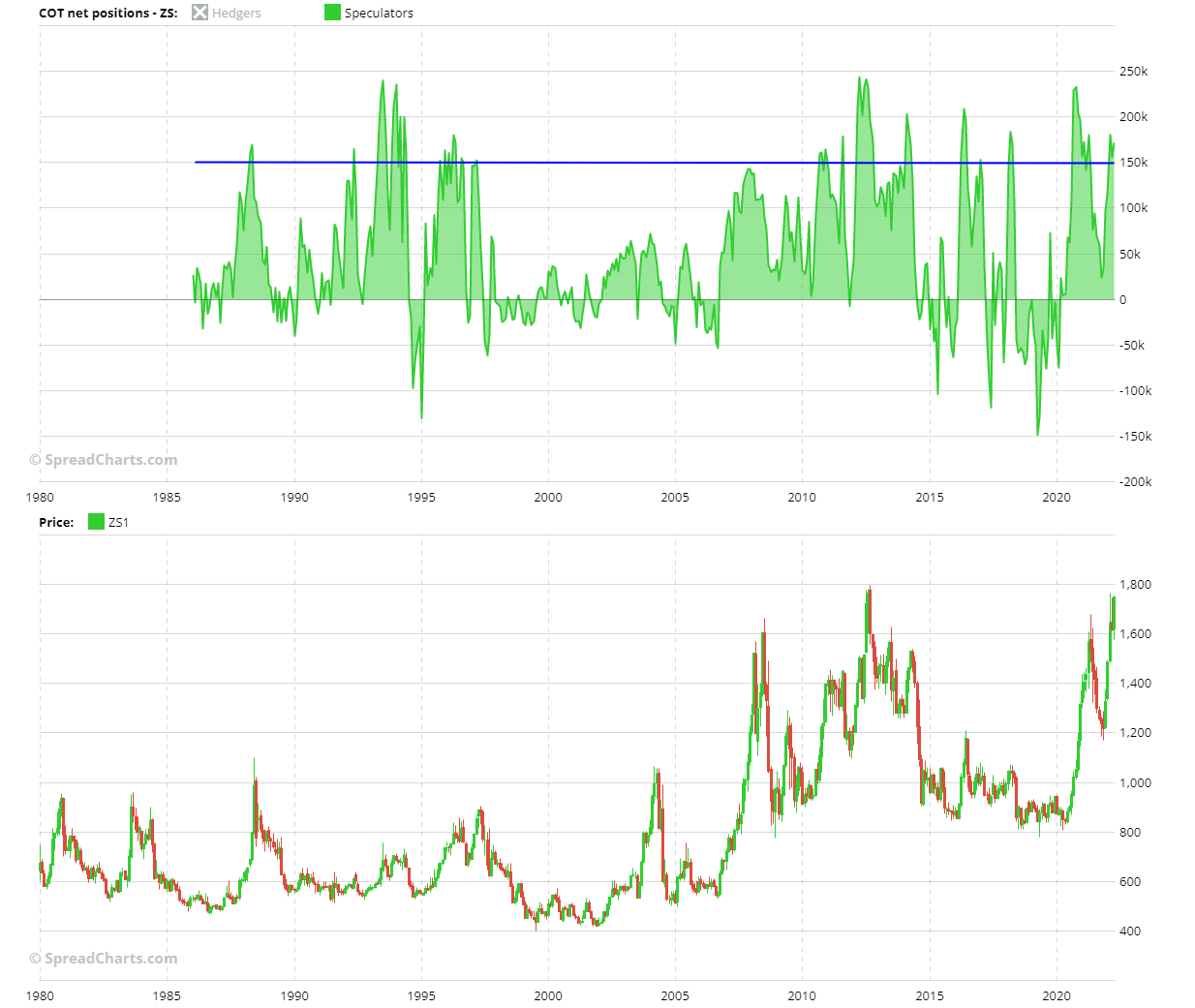 Kortom, de spread ZSU22-2*ZSX22+ZSF23 is zeer aantrekkelijk, en zeker minder riskant dan een eenvoudige spread met twee poten. Zoals u hebt gezien, zijn er echter verschillende overwegingen te maken en aspecten in de gaten te houden. In de Cot hebt u gezien dat de nettopositie van hedgefondsen nog steeds hoog is, zij het licht dalend, en dat de oorlog in Oekraïne de prijzen van veel grondstoffen hoog houdt, ook al is de volatiliteit op sommige daarvan toegenomen.