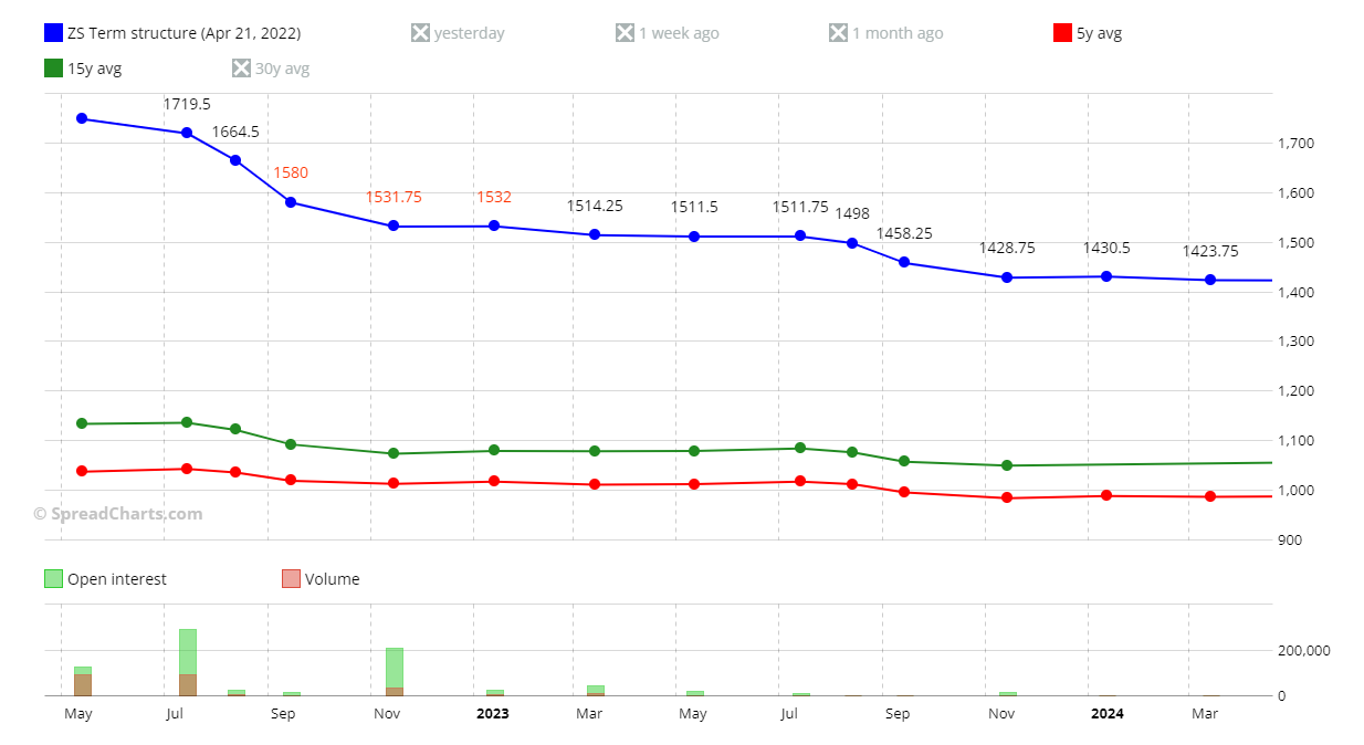 De sojabonenoogst vindt plaats tussen september en oktober, en op de termijnstructuur is de septemberlevering lager geprijsd dan de augustus- en soms zelfs de julilevering. Dit komt door het gebrek aan grondstoffen vóór de aankomst van de nieuwe oogst.