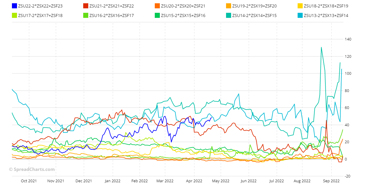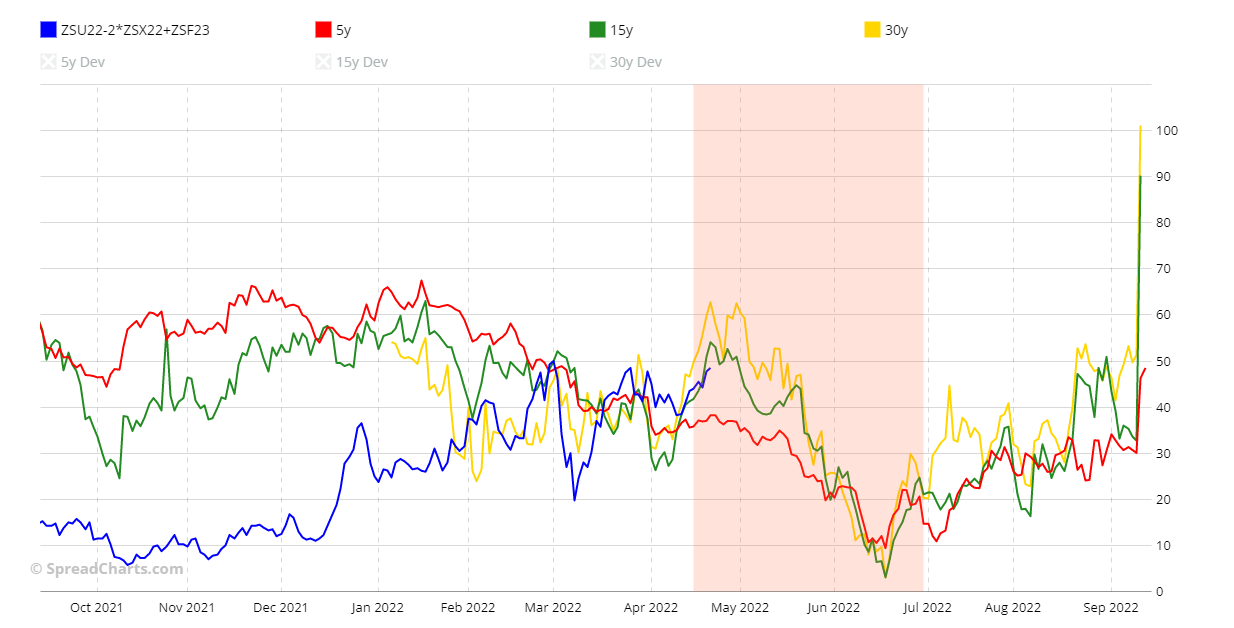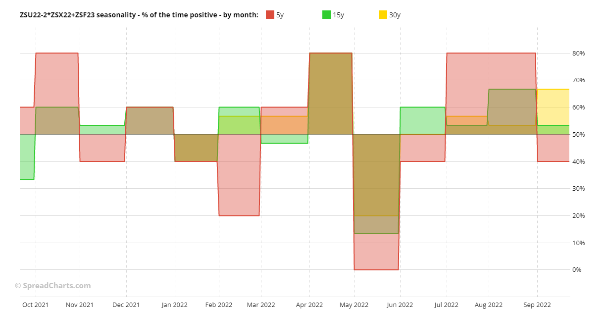 Uit de bovenstaande grafiek kunt u opmaken dat de backwardation van november ook sterk is, en over het algemeen ligt de prijs op dit moment in het jaar op hetzelfde niveau als in september. De verkoop van de ZSU22-2*ZSX22+ZSF23 spread is dus precies gericht op het benutten van deze anomalie in de termijnstructuur.