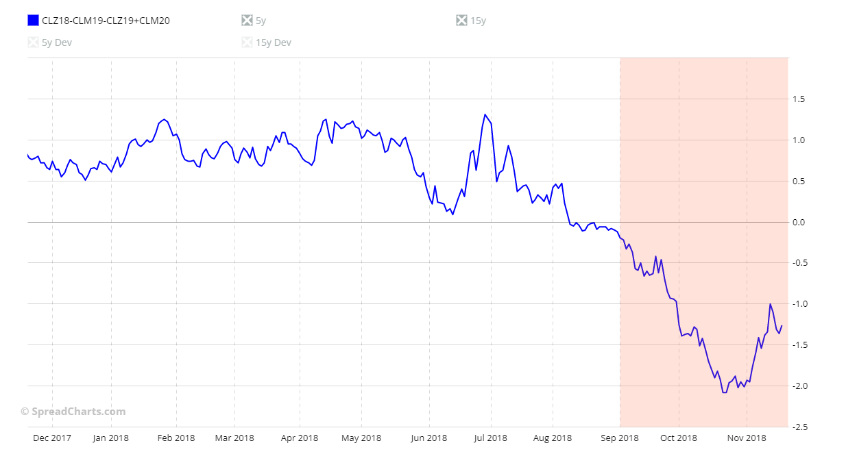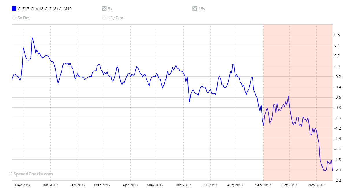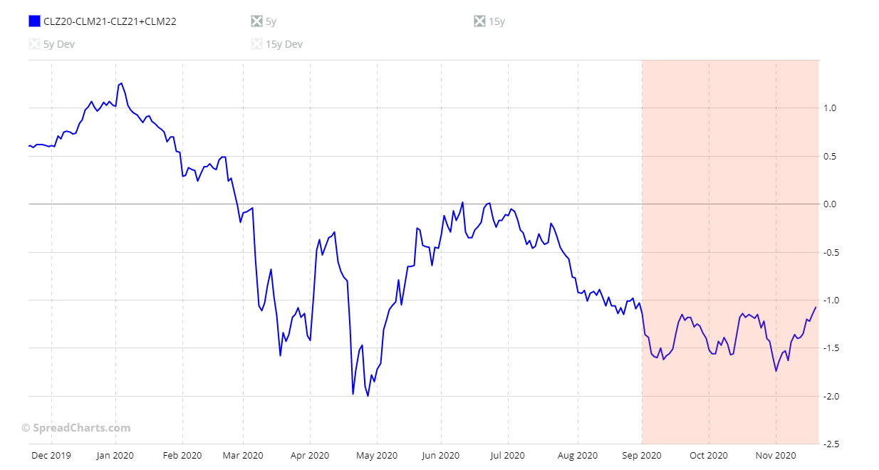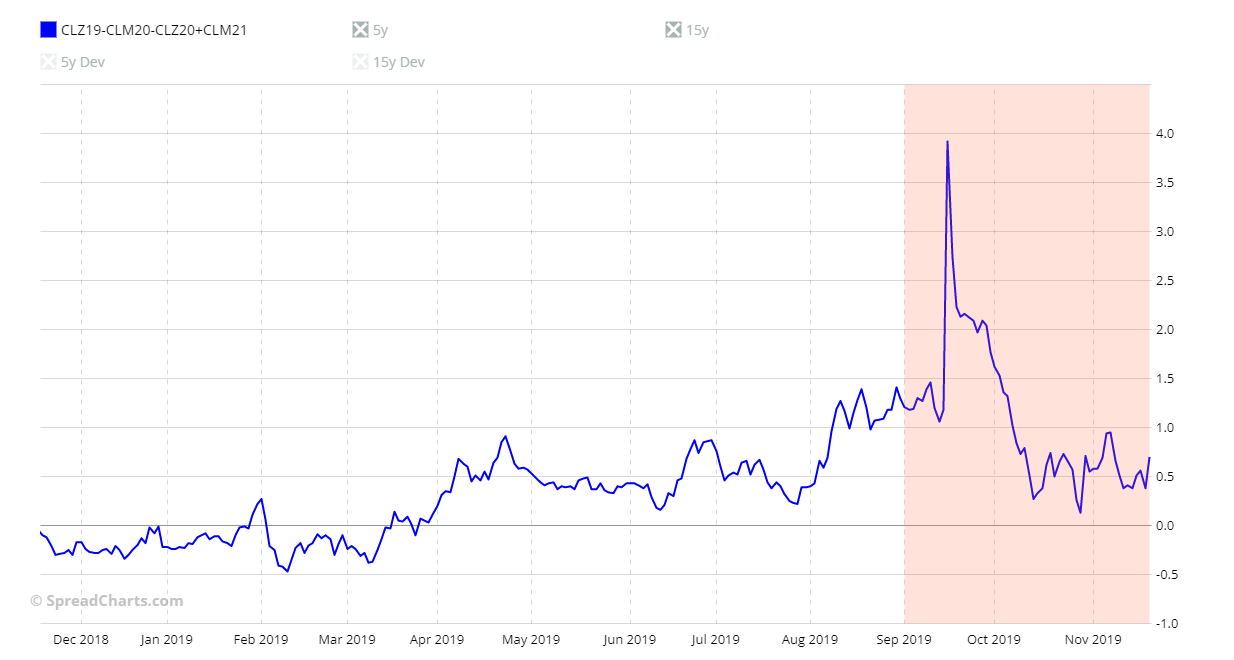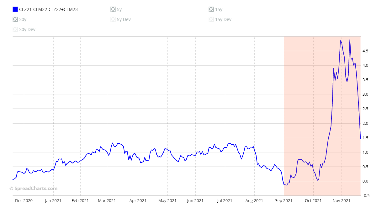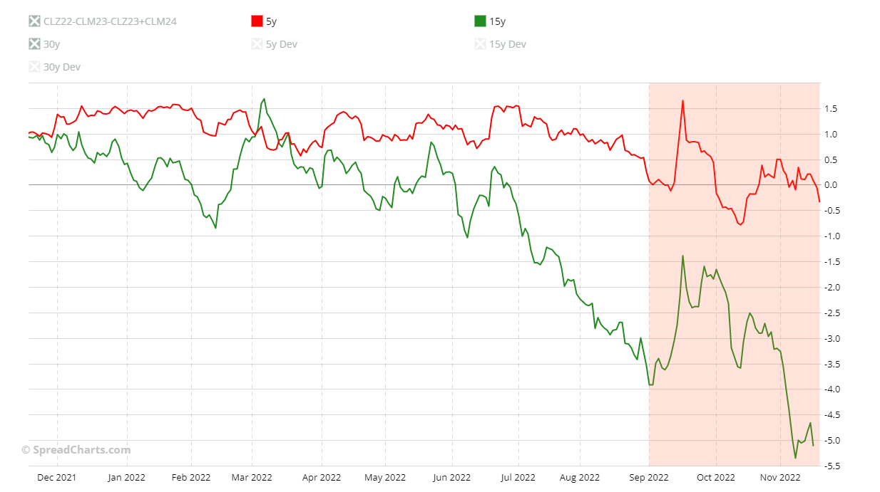The problem with these considerations is that it only takes one of the last 5 years with a strong movement against seasonality that the 5-year seasonal pattern will be significantly affected. Let me show you this with an example. Below you can see the CLZ22-CLM23-CLZ23+CLM24 spread chart.