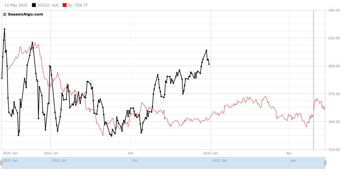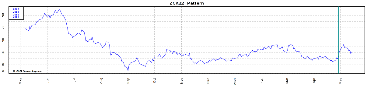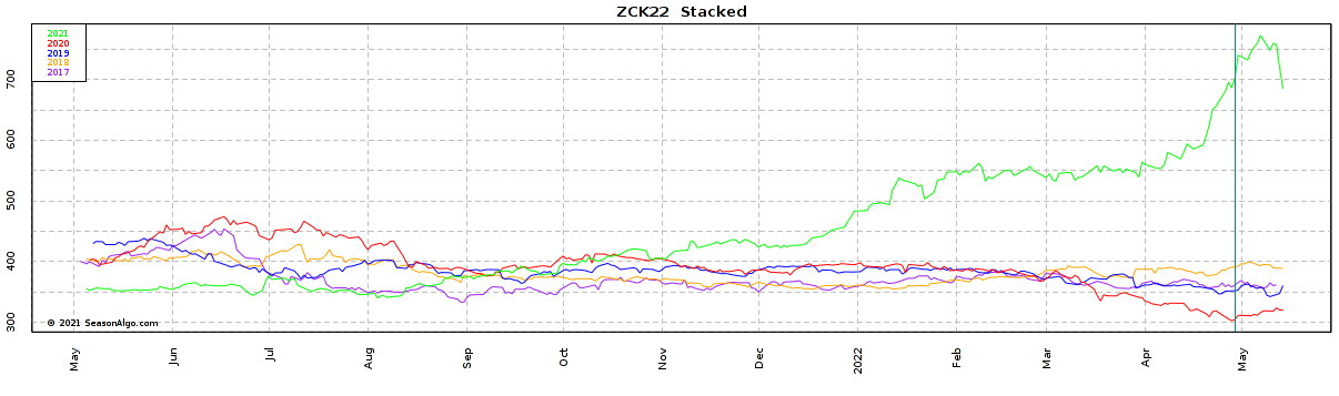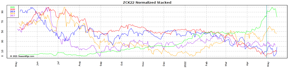 I want to build the 5-year seasonal pattern of the futures contract ZCK22 (using SeasonAlgo, I chose the corn because I am not a subscriber). Below you can see the Stacked chart of ZCK22 for the last 5 years (2017 to 2021).