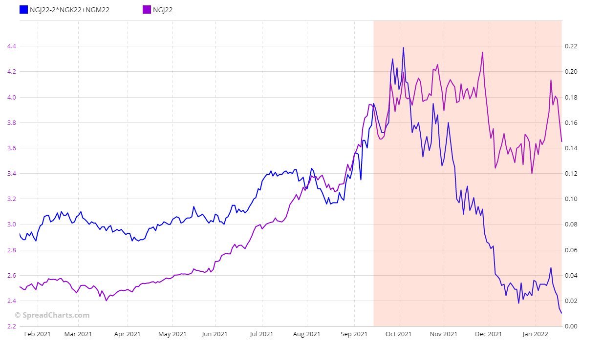 In the chart you can see not only the spread but also the underlying (NGJ22 in purple). It is evident the different volatility between the futures contract and the spread. Who follows the natural gas knows of the strong movements, both upwards and downwards, had from the commodity in the last months, with variations percentages also to double figure. With the spread, instead, these movements have not been there, the price has moved much more calmly.