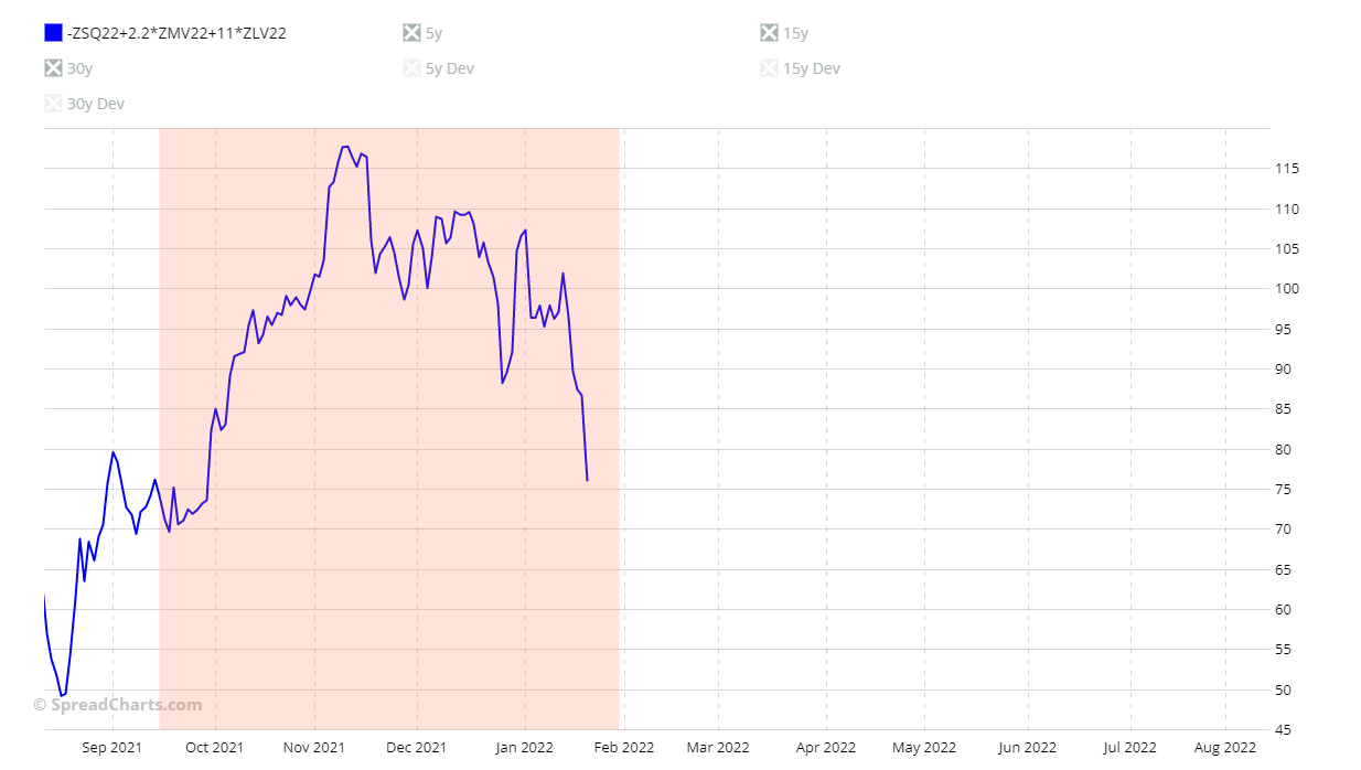 The second trade is a Crush Spread, -ZSQ22+2.2*ZMV22+11*ZLV22. The start of the seasonality is between mid-September and mid-October and lasts until around the end of January. You can see the chart below.
