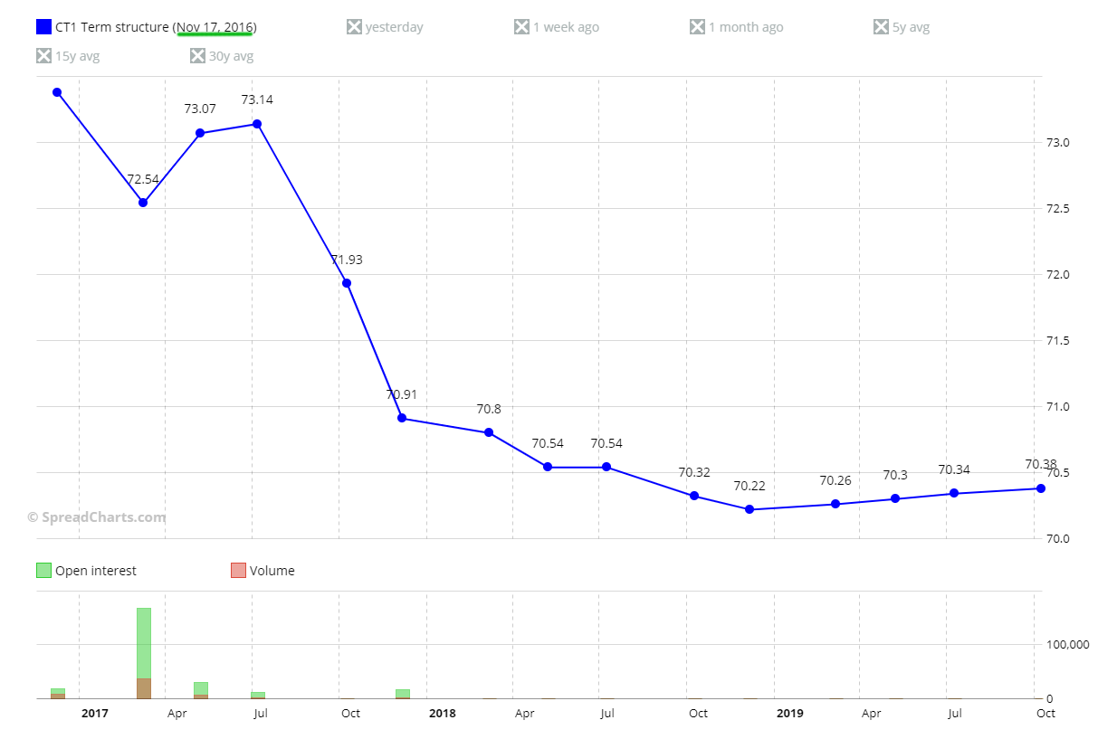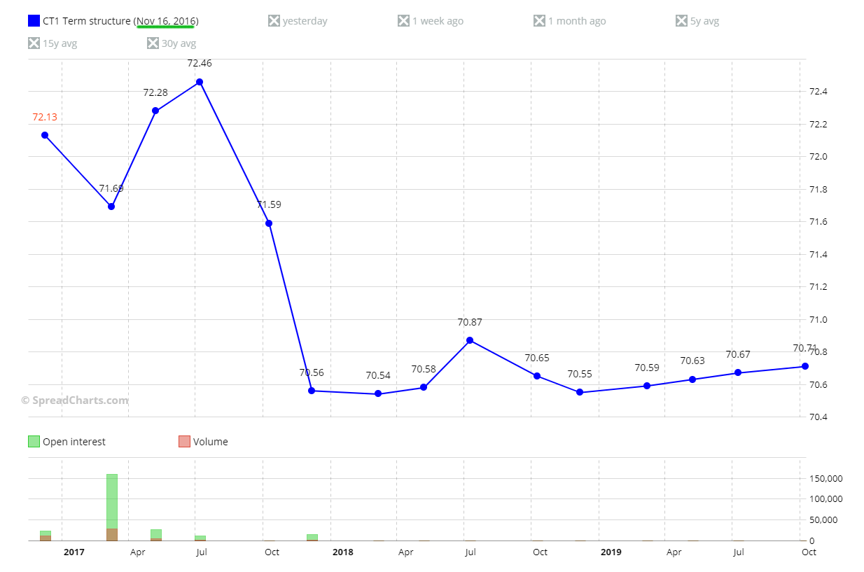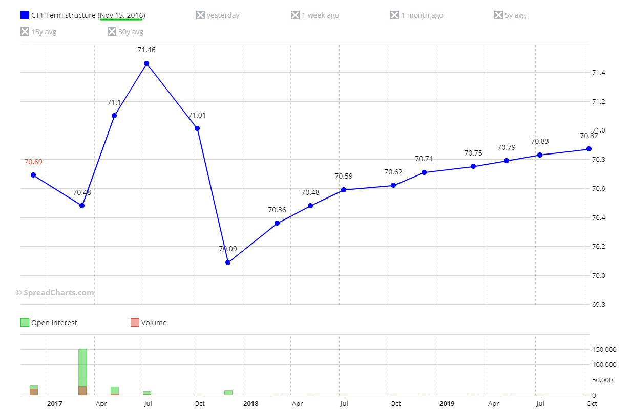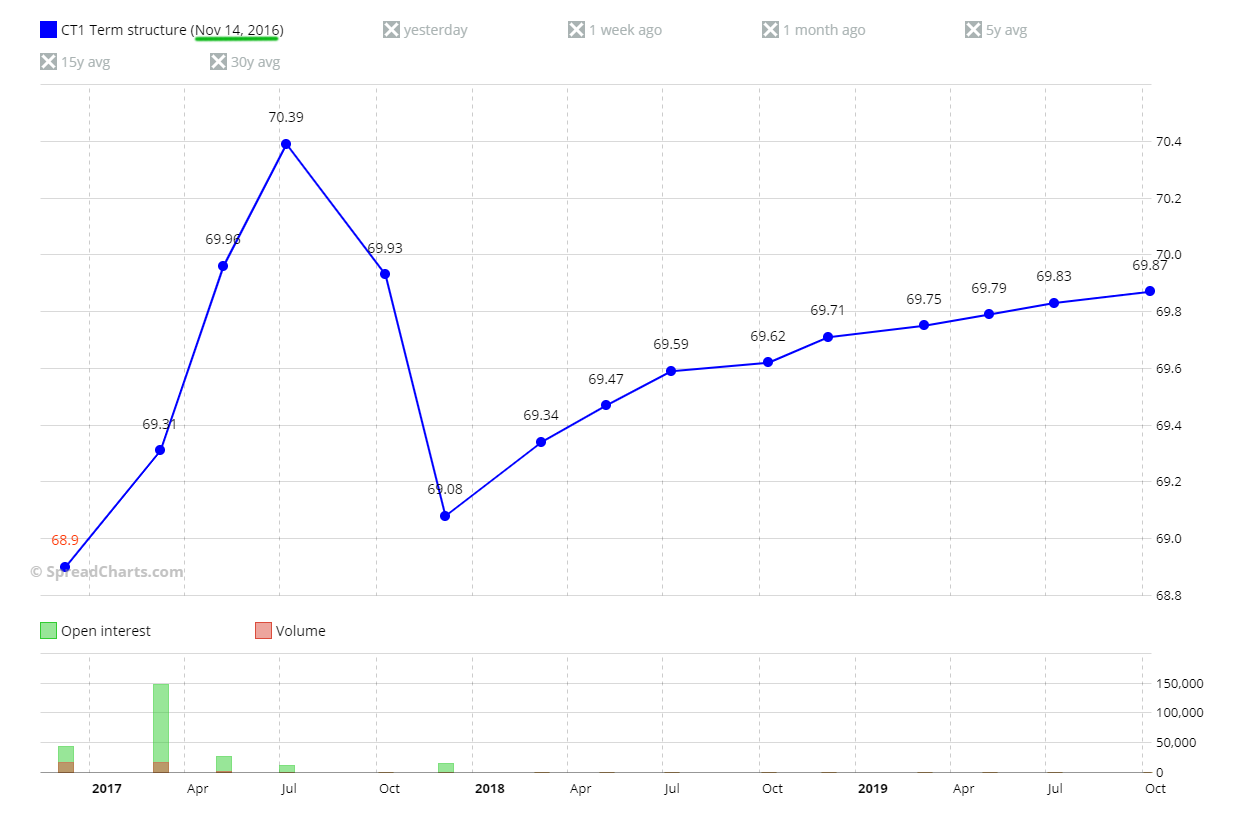 From the chart, you can clearly see that after about a year in which the spread moved within a range, in mid-November it made a strong bullish move. Before explaining the reason, which is common to many commodities anyway, I want to show you two charts. These reproduce the cotton term structure on 14 and 15 November 2016.