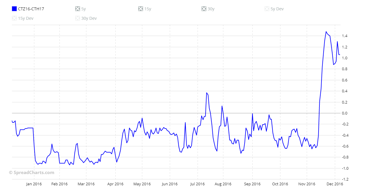 In her email, the trader brings me as an example an old spread from a few years ago but that does not change the substance. The chart is that of CTZ16-CTZ17 and you can see it below.