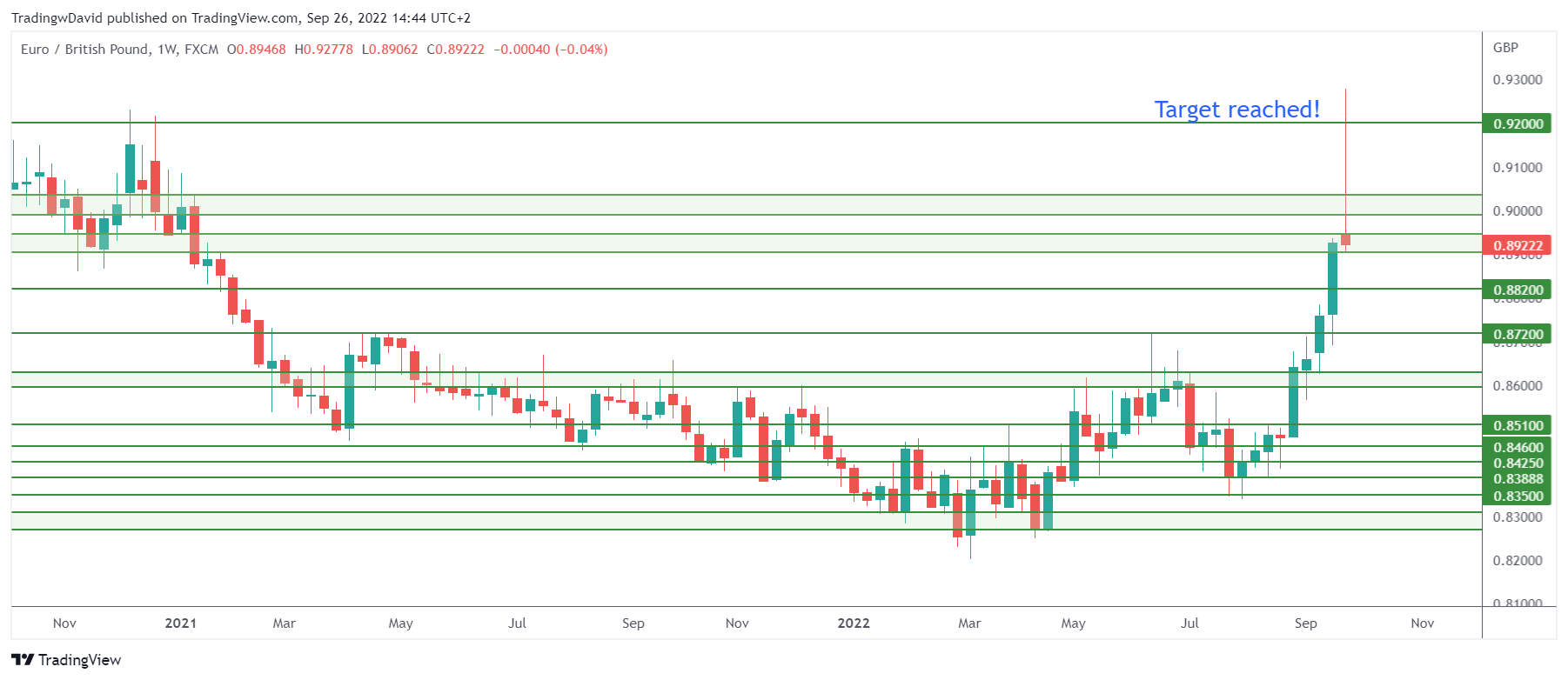 On 7 February, with the invaluable help of one of my co-workers, Hannah, I analysed Eur-Gbp (https://tradingwithdavid.com/en/euro-and-british-pound-what-has-emerged-from-the-meetings/). With the currency pair at 0.84425, I had given as targets in order: 0.85100, area 0.85950/0.86300 and in the following weeks/months, 0.87200, 0.88200, area 0.89050/0.89450, area 0.89950/0.90350 and final target 0.92000.