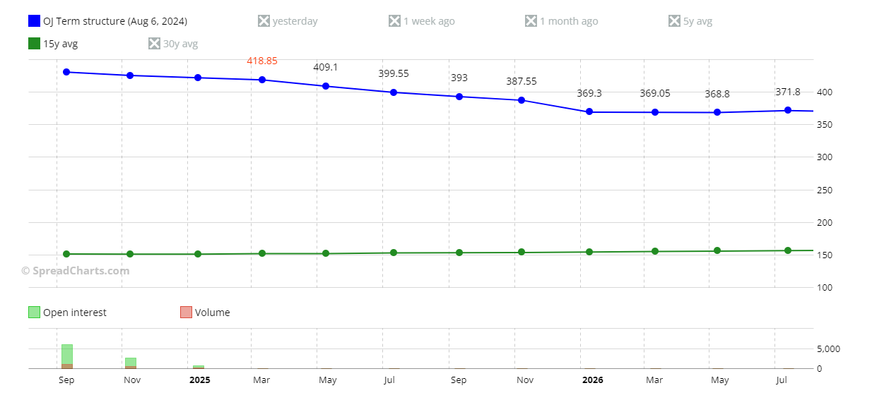 Another aspect that makes the spread risky is the low volumes (and open interest), especially for the March 2025 delivery; this spread is suitable only for experienced traders. The anomaly currently affecting orange juice is easily understood by looking at the term structure, with the current curve in backwardation and the 15-year average in contango.